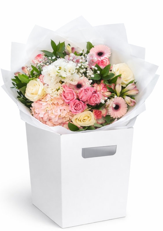A soft and elegant mix of pink and white flowers, including roses, hydrangea, and seasonal blooms, beautifully arranged with fresh greenery.