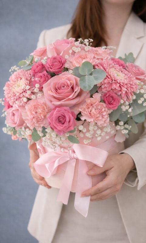 Elegant pink bouquet in a luxury flower box, featuring soft roses, carnations, and delicate greenery. Perfect for special occasions, gifts, or adding a touch of romance and beauty to any moment.